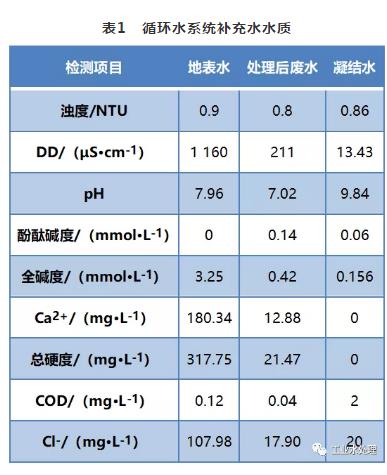 某火电厂2台300 MW亚临界燃煤自备湿冷发电机组为铝冶炼厂提供电力和工艺用蒸汽,其循环水系统以处理后的制药废水回用水、地表水以及铝冶炼厂蒸汽凝结水(以下简称凝结水)作为补充水水源,每台机组补充水量约为500 t/h,其中凝结水水量约80 t/h,其余为处理后的废水回用水和地表水。循环水各补充水水质见表1。