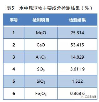 循环水受到强碱性物质污染后,其碱度和pH大幅升高,悬浮物质量浓度达到500 mg/L(水质正常时悬浮物质量浓度仅为12~20 mg/L)。因悬浮物含量高,导致循环水外观呈灰白色。将水中的悬浮物采用X-射线荧光能谱仪进行成分分析,结果见表5。