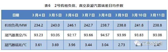 从表6可以看出,在负荷基本相同情况下,凝汽器真空、凝汽器端差等参数变化不明显,因此可以确认,循环水污染后经处理未造成凝汽器结垢。
