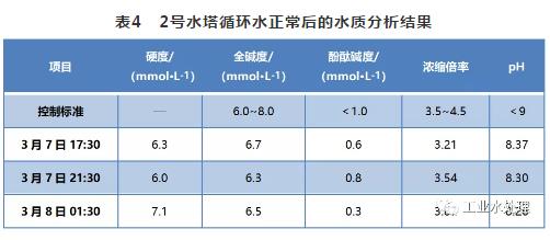 3月7日,对2号水塔循环水主要水质指标进行了分析(见表4),全碱度降至6.7 mmol/L,水质基本正常,2号水塔循环水外观也逐渐恢复正常。